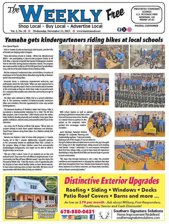 This week’s front page has a neat story on local elementary schools which are participating in learn-to-ride bicycle programs, thanks to Yamaha Motor Corp., USA. Also, readers will find a business spotlight on Southern Signature Solutions and their Distinctive Exterior Upgrades.