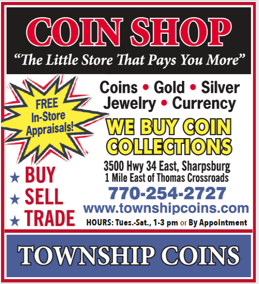 Township Coins is located at 3500 Highway 34 East, about 1 mile east of Thomas Crossroads. Hours are Tuesday thru Saturday 1-3 p.m. or By Appointment. For info, call 770-254-2727 or visit their website: www.townshipcoins.com.