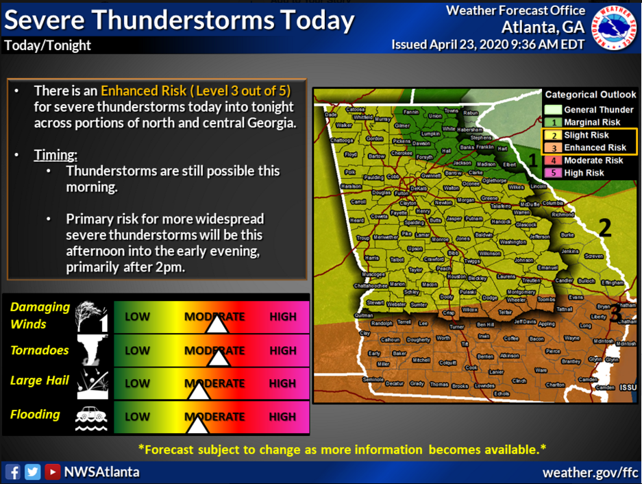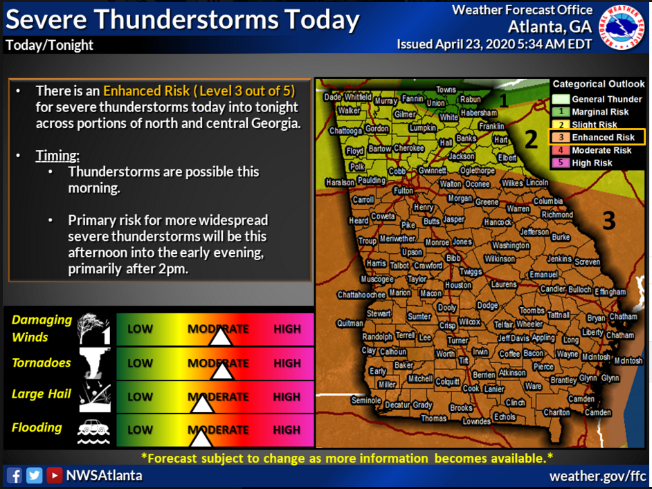 UPDATE (6:30 a.m. – Thursday) – From the National Weather Service in Peachtree City … Likely two rounds of rain and storms today. The first will be between 7 a.m. and 1 p.m. Thunderstorms are possible in the first round with some gusty winds. It’s the second round later today that the greatest risk for severe weather. That second round will be sometime after 3 p.m. and into the evening hours. The greatest threat then will be strong thunderstorms, damaging winds, large hail and tornadoes.
