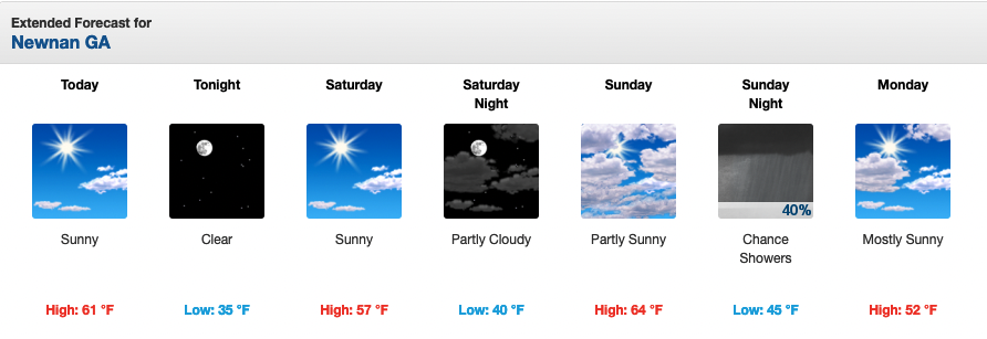The National Weather Services in Peachtree City says to expect today’s high temperature to be only 61 degrees with sunny skies, some 13 degrees cooler than Thursday’s high of 74. Tonight’s overnight low will be 35. North and East winds will be 5-10 mph, gusting to 20.