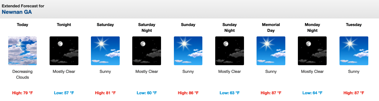After week filled with off-and-on rain, the Memorial Day Weekend forecast calls for plenty of sunshine according to the National Weather Service in Peachtree City.