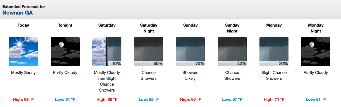 Below is the extended forecast for Coweta from the National Weather Service in Peachtree City as of 6:15 a.m. on Friday, Oct. 28, 2022. For up-to-date weather information, visit: NWS Newnan Page.