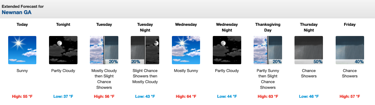 Below is the extended forecast for Coweta from the National Weather Service in Peachtree City as of 6:55 a.m. on Monday, Nov. 21, 2022 and is subject to change. For up-to-date weather information, visit: NWS Newnan Page.