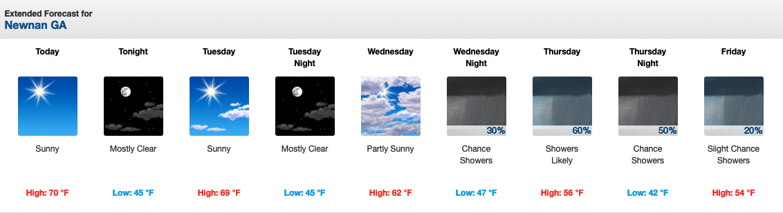 Below is the extended forecast for Coweta. For more weather information, visit: NWS Newnan Page.