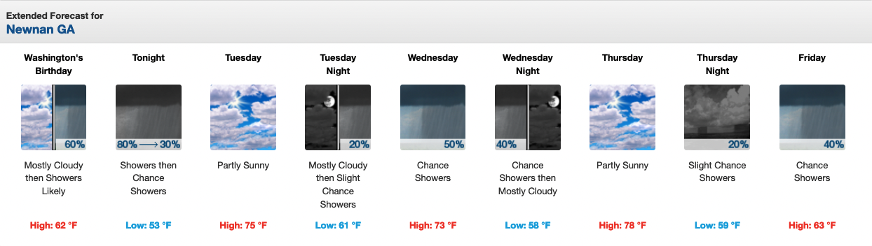 Below is the extended forecast for Coweta from the National Weather Service in Peachtree City as of 6 a.m. on Monday, Feb. 21, 2022. For up-to-date weather information, visit: NWS Newnan Page.