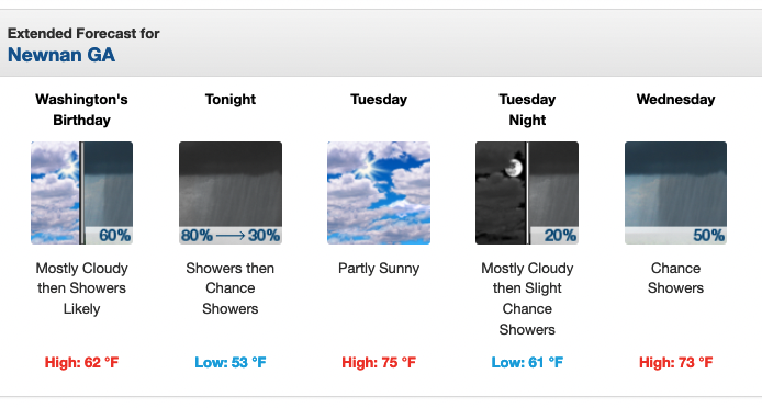 Coweta County can expect spring-like high temperatures this work week, but with it comes rain today, Wednesday and Friday.