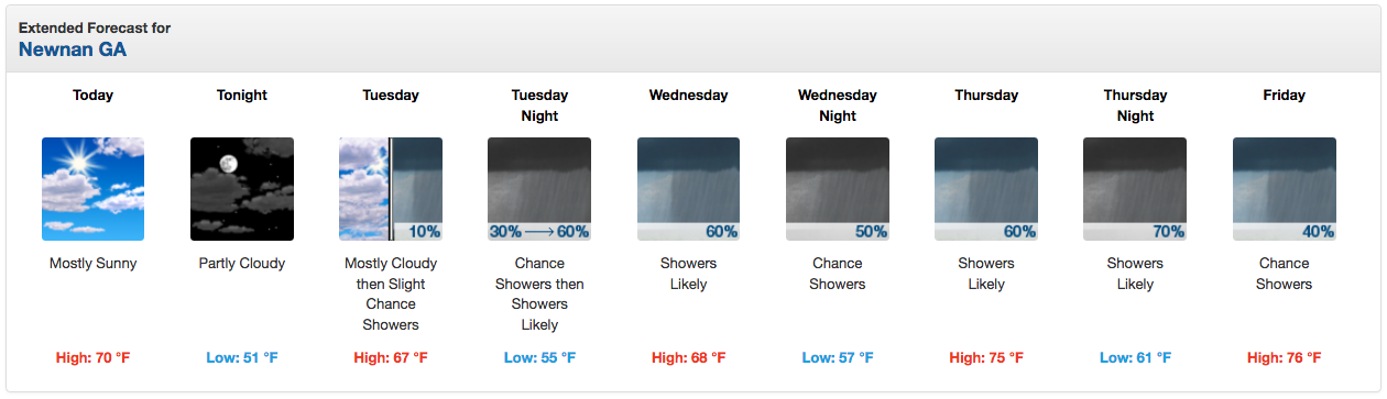 Below is the day-by-day forecast (subject to change) from the NWS. And for more weather information, visit: NWS Newnan Page.