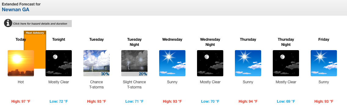 The National Weather Service in Peachtree City says to expect Heat Index Values (temperature plus humidity) at 100 degrees today (Monday) and Tuesday. High temperatures will be in the mid-90s all week with little or no chance of an afternoon pop-up shower. In fact, the only mention of rain is a 30 percent chance on Tuesday.