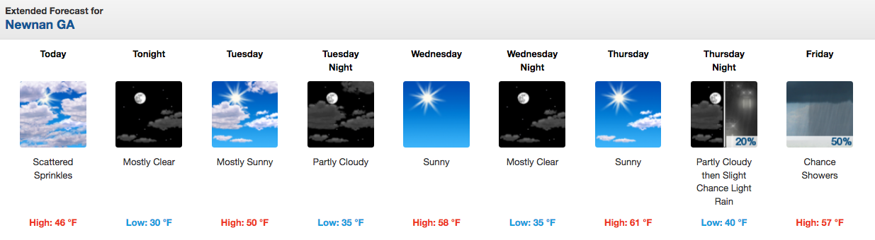 After a brief period of sprinkles on Monday morning, the National Weather Service in Peachtree City says to expect mild temperatures with no rain chances until Friday.