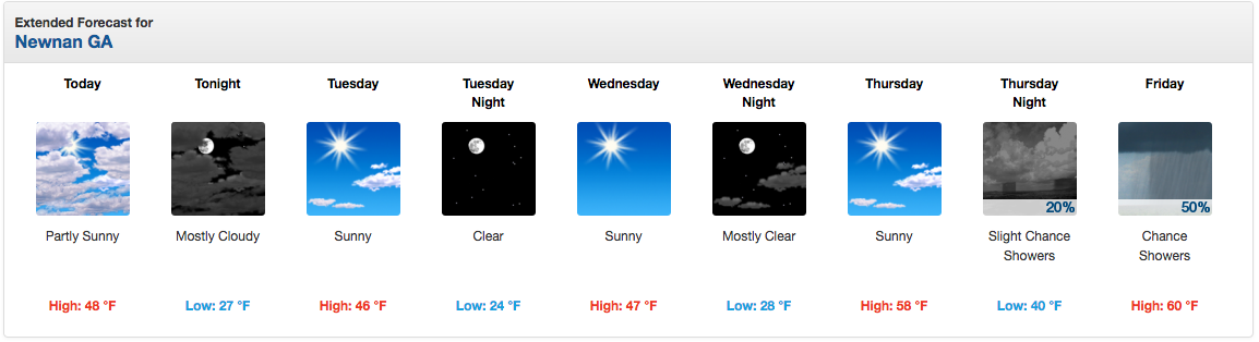 A strong cold front moved through the area yesterday, bringing with it the multiple tornadoes and fatalities to the south of Coweta and this burst of colder air. Highs through Wednesday will be in the mid-40s with lows in the mid-20s. Northwest winds will be gusty, generally 10-15 mph thru Tuesday with gusts as high as 25.