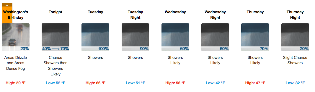 MONDAY – Areas of drizzle before 10am, then a slight chance of showers after 1pm. Areas of dense fog before 10am. Otherwise, cloudy, with a high near 59. East wind around 5 mph. Chance of precipitation is 20%.