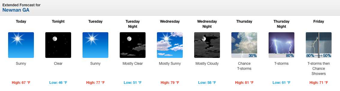 Sunny skies are forecast by the National Weather Service in Peachtree City through Thursday with a slight chance of rain on Thursday, and an 80 percent rain chance on Friday.