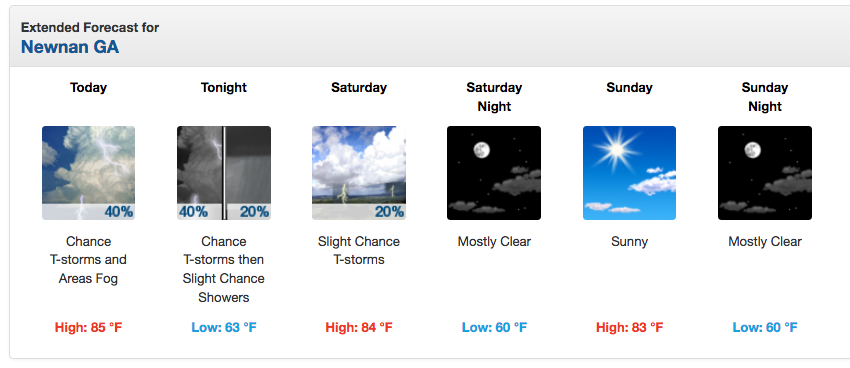 SATURDAY – A slight chance of showers between 10am and 11am, then a slight chance of showers and thunderstorms after 11am. Mostly sunny, with a high near 84. Northwest wind around 5 mph. Chance of precipitation is 20%.