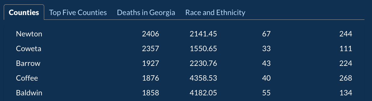 Coweta County cumulative totals for cases, deaths and hospitalizations from the GA DPH website.
