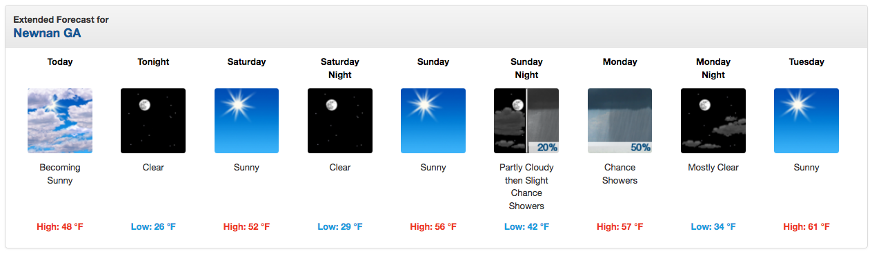 Below is the day-by-day forecast (subject to change) from the NWS. For up-to-the minute weather information, click the NWS Newnan Page.