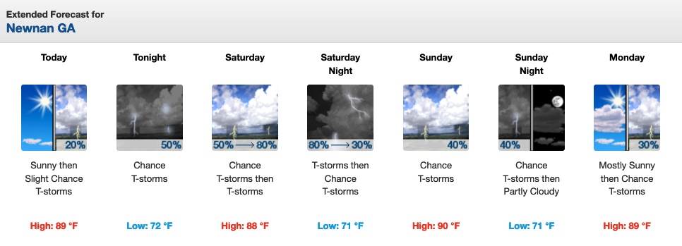 Saturday’s forecast has the best chance of showers or thunderstorms of the weekend. NWS has placed an 80 percent rain chance both Saturday and Saturday night for Coweta County as the cold front which is producing the devastating rain and flooding in Kentucky dips into northern Georgia.