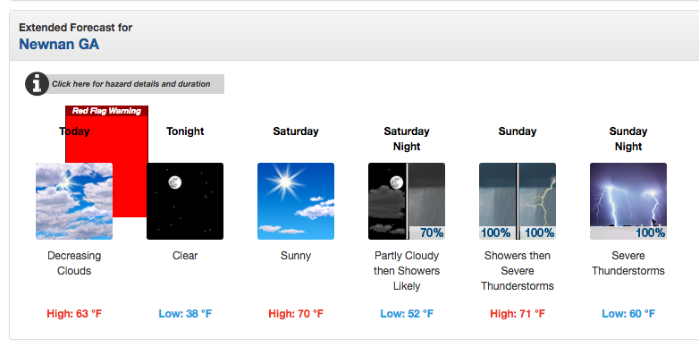 In addition for today, a Red Flag Warning is in effect for much of North and Central Georgia, including Coweta County, from 11 a.m. until 8 p.m. This means low relative humidity (20 percent) and strong winds of 12-18 mph, gusting to 25-30 mph, will allow a fire to spread rapidly. A Red Flag Warning means that critical fire weather conditions are either occurring or will occur within 24 hours. Please refer to the local burn permitting authorities on whether you can burn outdoors.