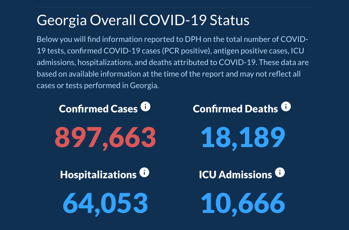 Georgia has confirmed cumulative totals of 897,663 cases, 18,189 deaths, 64,053 hospitalizations and 10,666 ICU admits since the pandemic began.