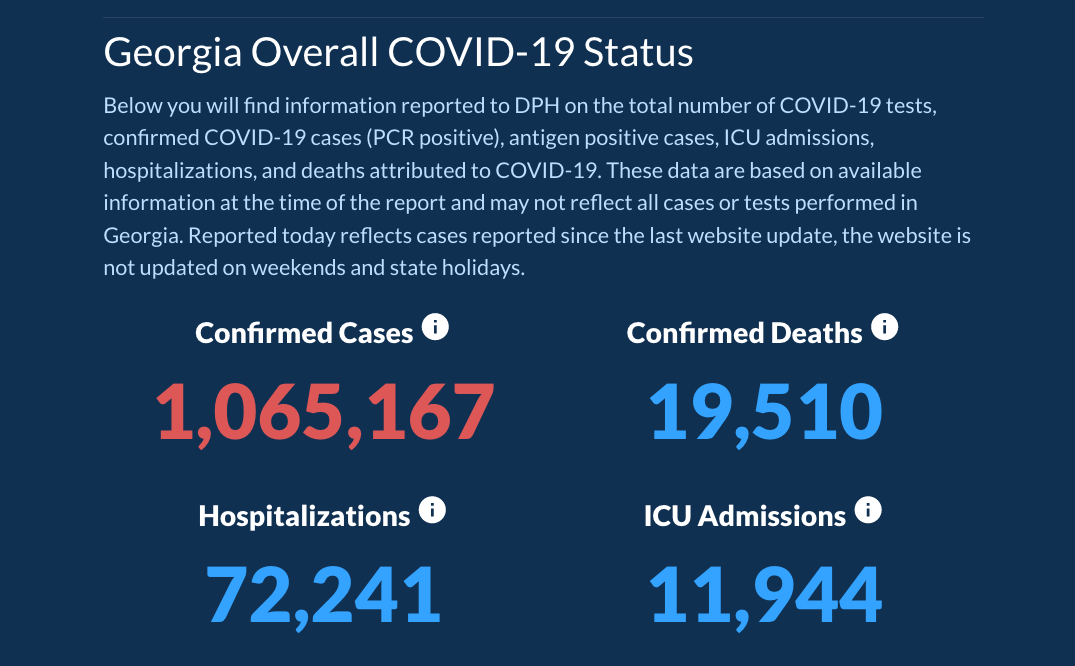 Georgia has confirmed cumulative totals of 1,065,165 cases, 19,510 deaths, 72,241 hospitalizations and 11,944 ICU admits thru Aug. 27 from when the pandemic began.