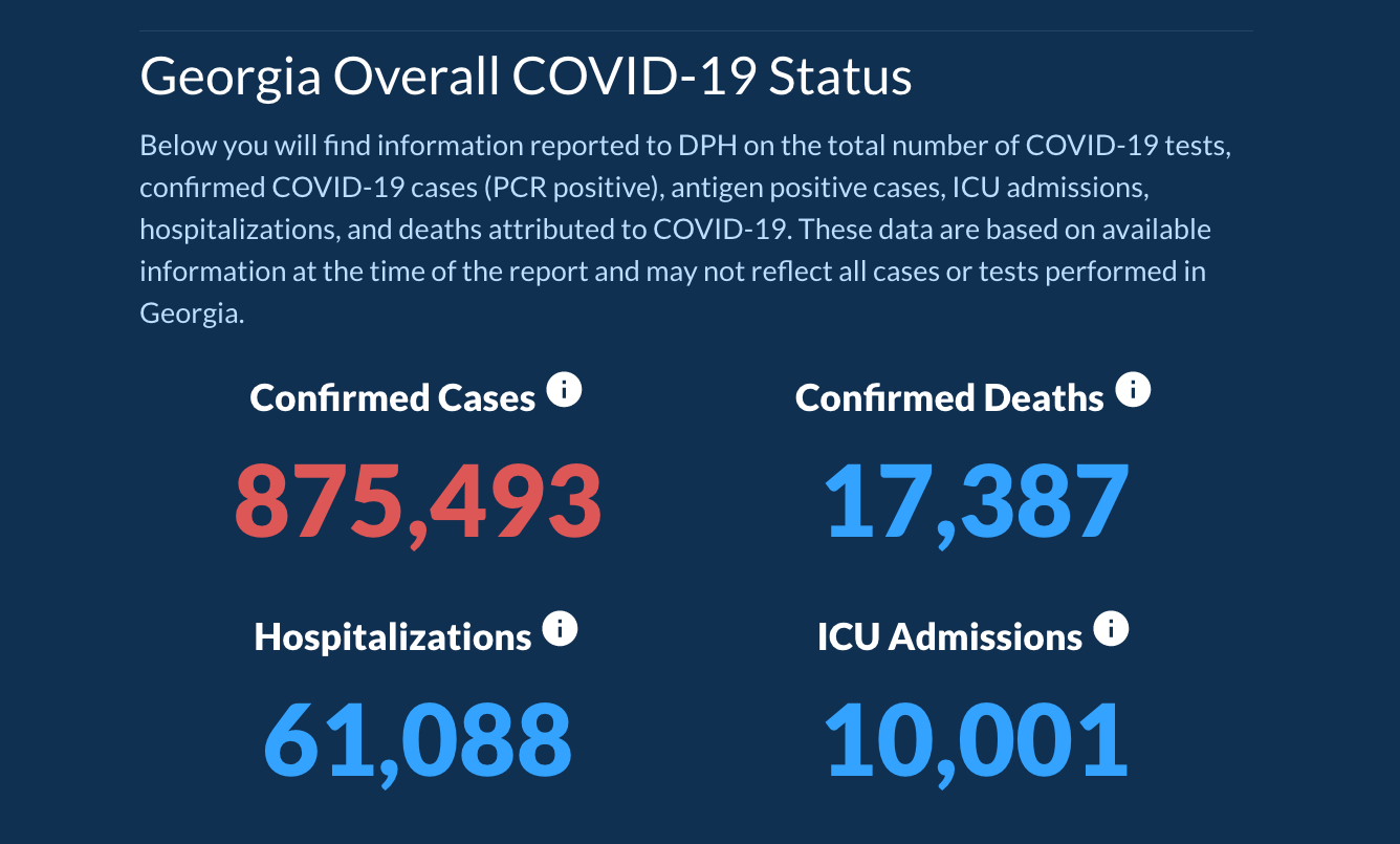 Georgia has confirmed cumulative totals of 875,493 cases, 17,387 deaths, 61,088 hospitalizations and 10,001 ICU admits since the pandemic began.