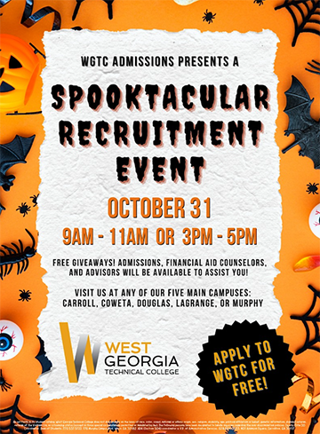 West Georgia Technical College is hosting a Spooktacular Recruitment Event on Monday, October 31 from 9 to 11 a.m. and 3  to 5 p.m.